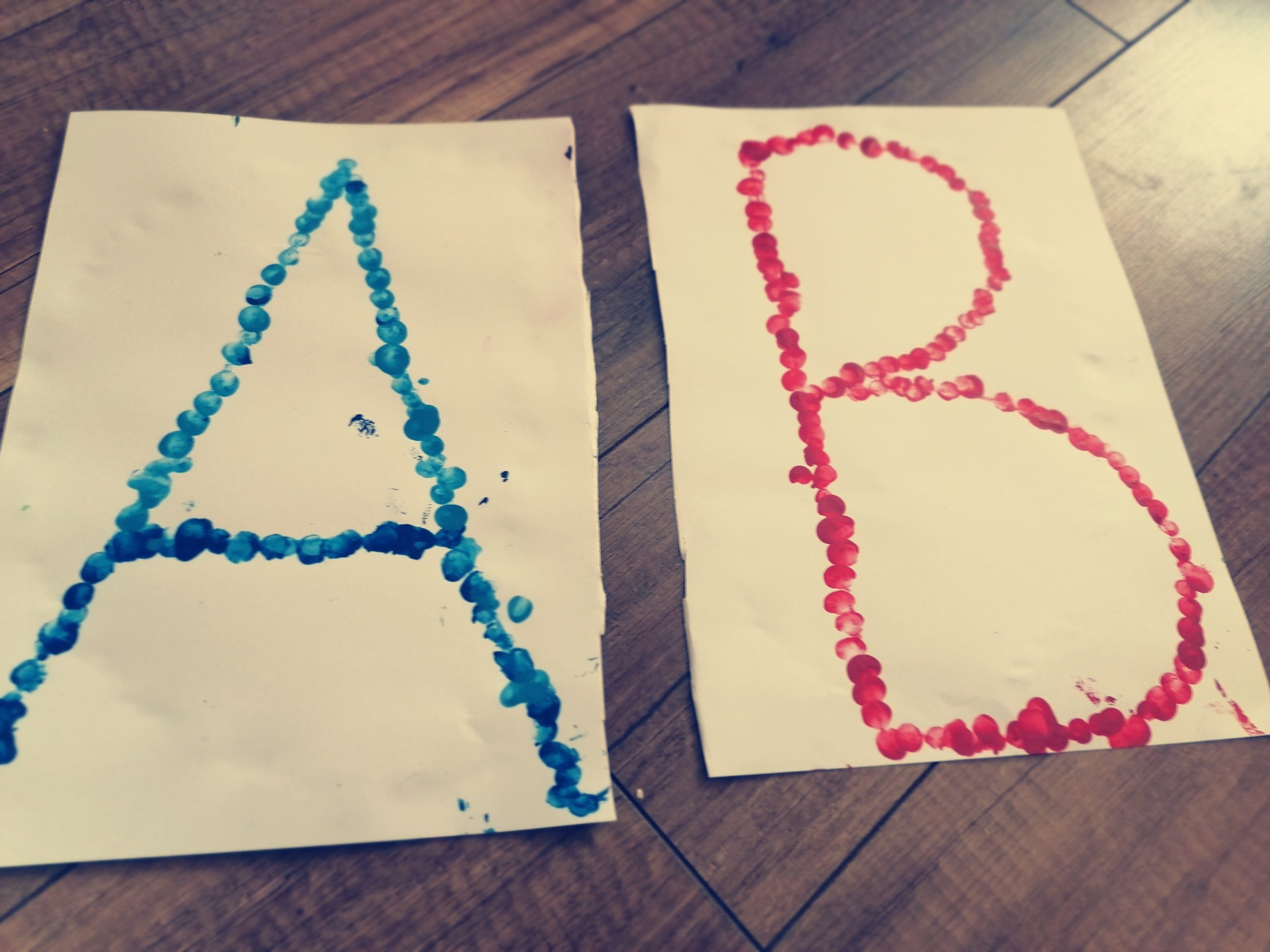 Veľmi dobrá a zaujímavá aktivita na koordináciu oka s rukou👁️🖐️. Napísali sme si veľké tlačené písmená🆎🅱️🅰️. A postupne namáčali pršteky do príslušných farieb a odtláčali bruško prsta po čiare písmenka.