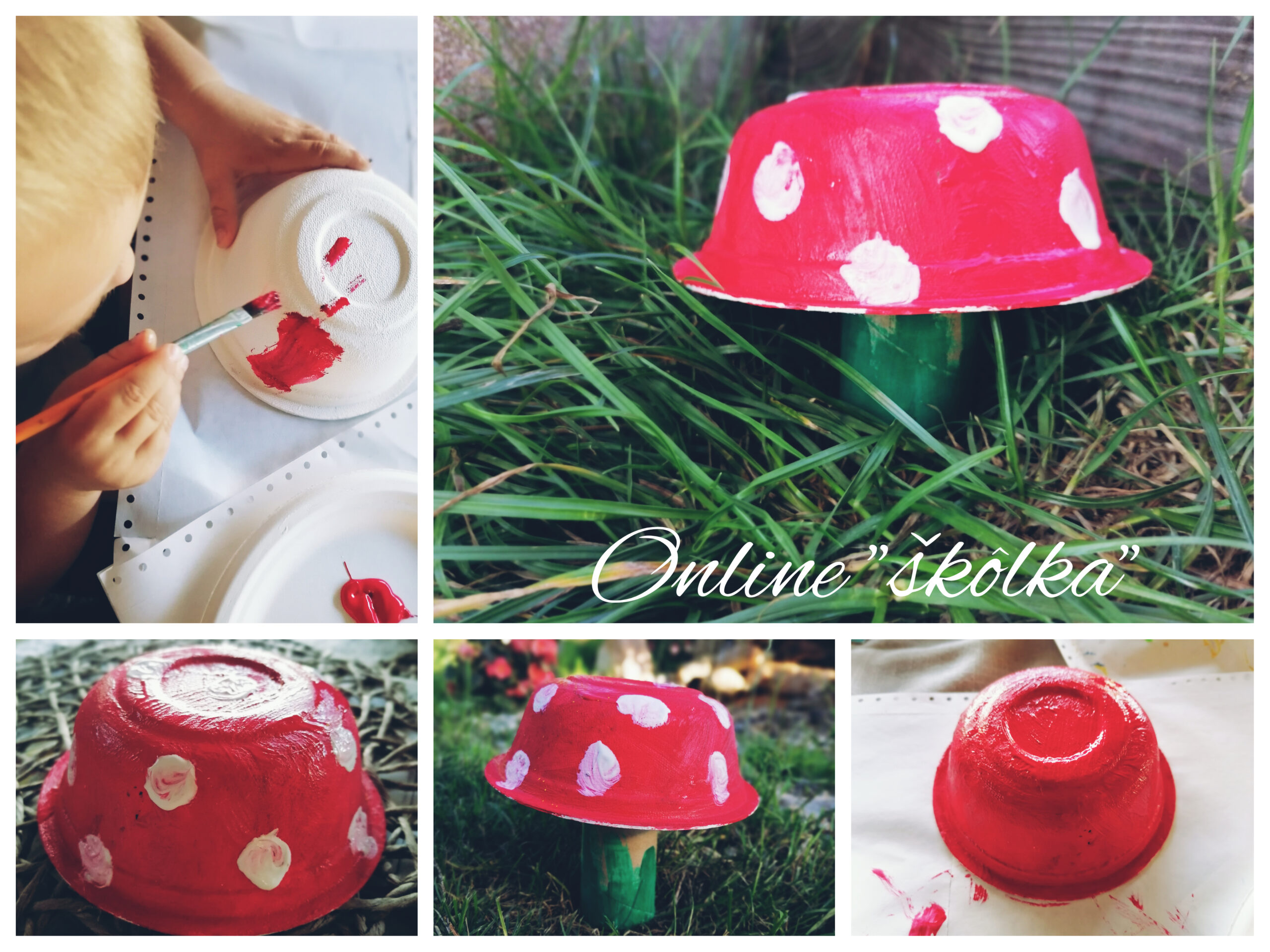 Rolku sme si nafarbili na zeleno(my sme si namaľovali iba akoby trávu) a tanier na červeno. Na tanier sme si domaľovali aj biele bodky. Spojili sme ich dokopy a vznikla nám krásna avšak nebezpečná muchotrávka zároveň 🙂.🌳🌲