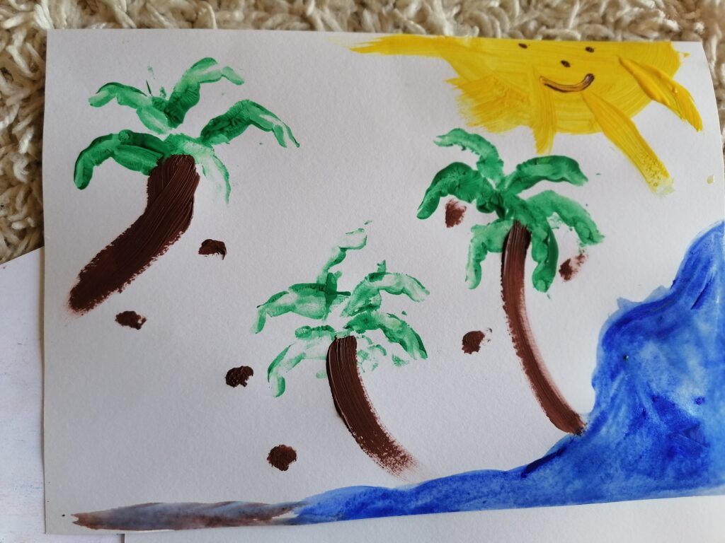 V tomto pozdrave sme využili viac techník a najskôr sme si pozdrav vymaľovali na modro. Miešali sme dve farby bielu a modrú, čím sme získali farbu svetlomodrú. 🙃